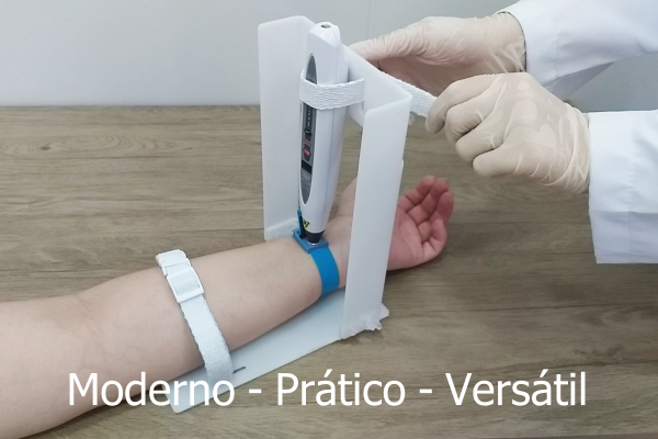 Ao utilizar o Suporte para ILIB no braço, ele ficará em posição horizontal apoiado na base e parcialmente imobilizado pela cinta, evitando que se movimente. O seu aparelho de Laser Ilib será posicionado verticalmente e fixado pela cinta superior, com isso ele permanecerá estável durante a aplicação do Laser.